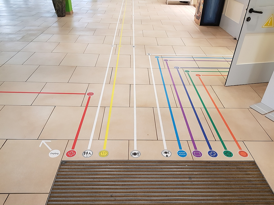 Die Bodensymbole führen Sie zu Ihren ersten wichtigen Anlaufstellen im Berufsbildungswerk.