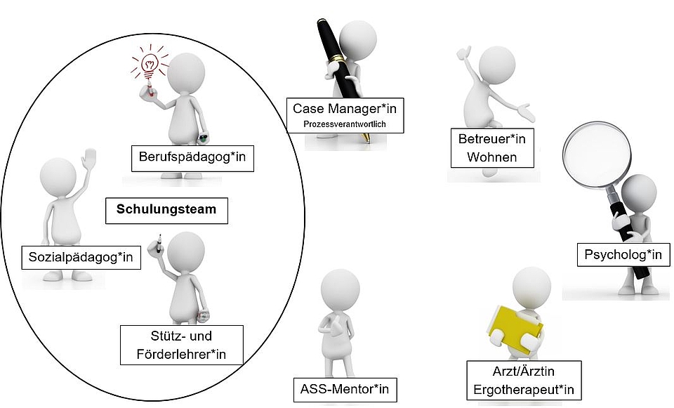 Neben Ihrem persönlichen Ansprechpartner/Ihrer persönlichen Ansprechpartnerin (Case Management) besteht unser multiprofessionelles Team aus unseren Psycholog*innen, Ärzt*innen, Sozialpädagogik, Ergotherapie, Berufspädagogik, Pflege, Fachdienst Autismus, Förder- und Stützlehrkräften und Ihrem Bezugsmitarbeitenden aus dem Bereich Wohnen.