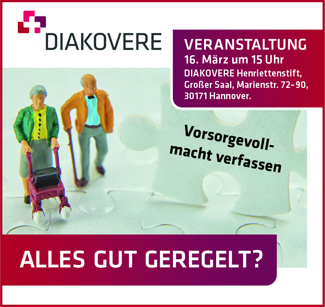 Eine kostenfreie Veranstaltung der DIAKOVERE Hannover, dem Gesamtunternehmen aus Annastift, Friederikenstift und Henriettenstift. Mit Dr. Corinna Neumann, Rechtsanwältin/Notarin, GÖHMANN Hannover, Prof. Dr. Olaf Krause, Chefarzt Zentrum für Medizin im Alter im DIAKOVERE Henriettenstift sowie Dr. Michael Schmidt, Vorstandsvorsitzender Anna-von-Borries-Stiftung.